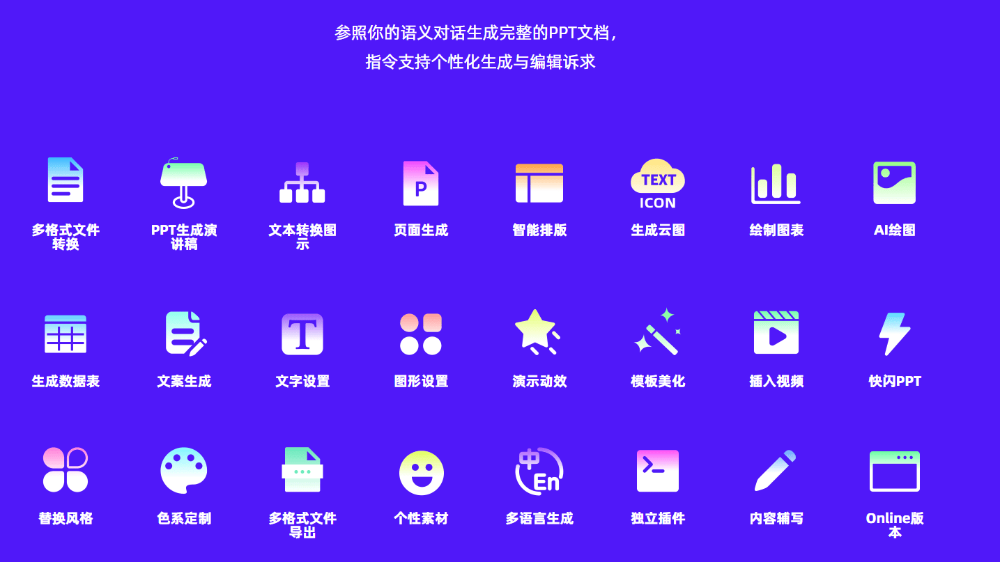 ChatPPT的功能特色:1、AI Chat指令式内容生成与创作:基于AI技术,用户只需输入简洁的文字指令,ChatPPT就能自动生成符合要求的PPT内容。这种指令式的内容生成方式省时省力,大大提高了创作效率。