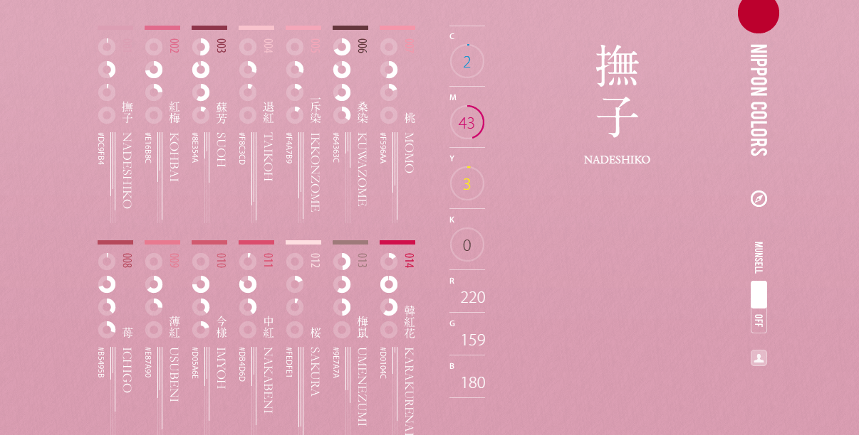 Nippon Colors是一个专注于展示日本传统色彩的在线平台。它为设计师、艺术家以及对日本文化感兴趣的人们提供了一个独特的色彩资源库。这个网站由ONO TAKEHIKO制作,版面精美细致,风格简练大气,总共收录了250种最能代表日本的传统颜色。这些色彩不仅拥有诗意的名字,还附带了相应的CMYK、RGB和HEX色码,方便用户在设计工作中直接复制和应用。