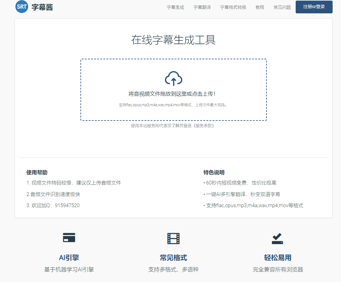 字幕酱是一个功能强大的在线字幕生成及翻译工具,它基于人工智能技术,提供了百度、腾讯、小牛等多家引擎的自动在线字幕多语种翻译服务。它支持包括中文、英文、俄语、粤语、日语、韩语、德语、法语、西班牙语等在内的多种语言。