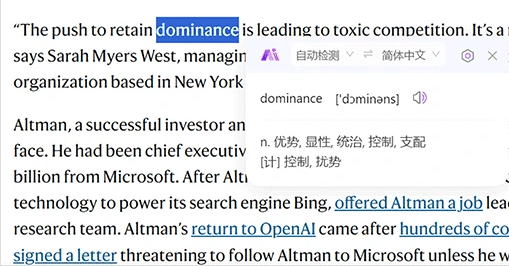 遇到生词时,用户只需使用鼠标划选该词,会译便能立即提供翻译,并且还可以跟随读音、了解词性,甚至提供具体的使用场景。无论是学习还是工作场景,“会译”都能为用户提供强大的支持,真正做到了哪里不会点哪里。