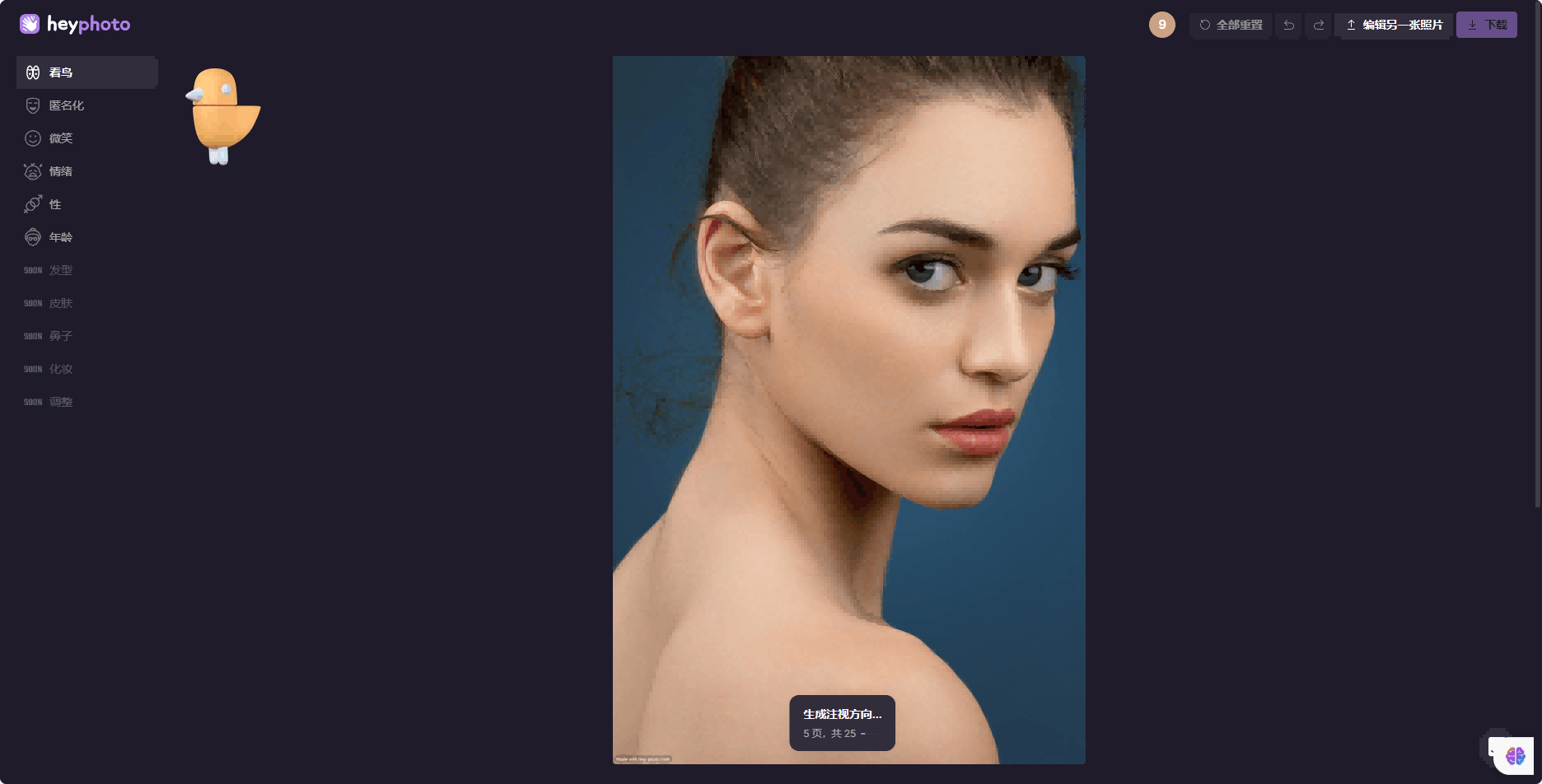 3、上传照片后将进入AI编辑器,左侧有Look at bird、Anonymize、Smile、Emotions、Gender、Age等编辑项目。编辑完成后,点击右上角的「Download」按钮即可下载编辑完成的图片。
