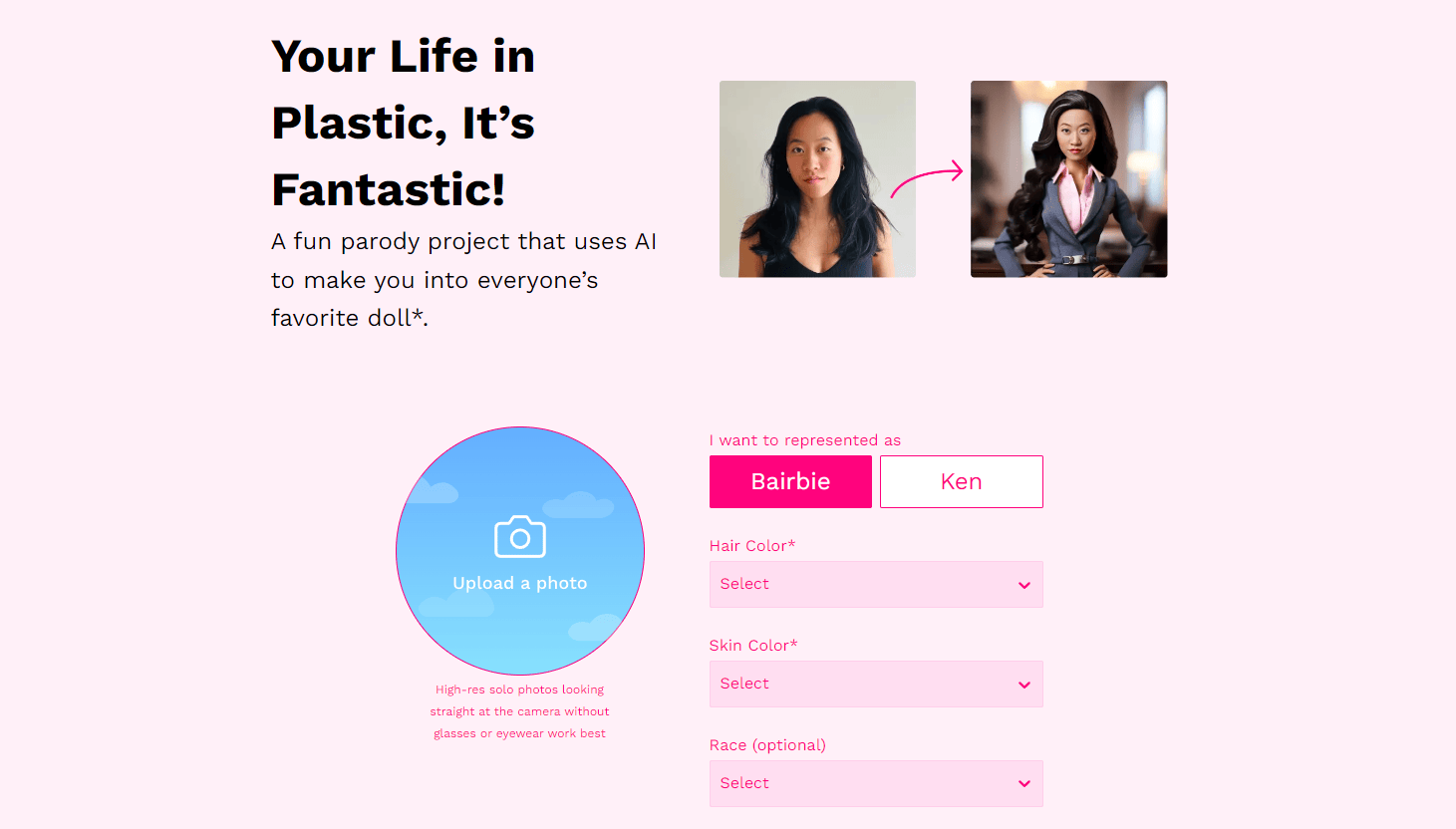 BaiRBIE.me是一个AI芭比化生成器,让你的自拍变成芭比风格。它使用AI技术让用户上传照片后,将普通的自拍照变成迷人的Barbie化形象。这个网站提供了一个有趣的仿真体验,称为“你超棒的塑料生活”,用户可以选择成为芭比或肯尼,还可以选择头发颜色、肤色和种族。如果你想尝试,只需上传一张高清的、直视镜头的个人照片(最好不戴眼镜),然后填写一些个人化选项,就可以生成你的AI芭比形象了。