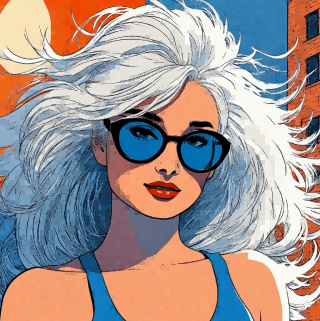 小编给出的提示词是:backlight, messy hair, street style, a woman img, supple skin, hydrated lips, stylish sunglasses, white hair, grainy Sense, white through red, color blue & orange contrast, facing the camera(背光,凌乱的头发,街头风格,女人的形象,柔软的皮肤,水润的嘴唇,时尚的太阳镜,白发,颗粒感,白色到红色,蓝色和橙色的对比,面对相机)