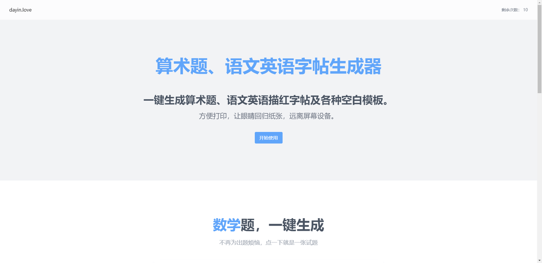 dayin.love 是一个算术题、语文英语字帖生成器,一键生成算术题、语文英语描红字帖及各种空白模板。无论是家长为孩子准备学习材料,还是教师为学生制作教学资源,dayin.love 都能提供便捷的解决方案。用户可以根据需要选择算术题目生成器或字帖生成器,一键生成所需内容,并直接打印出来,非常适合幼儿园到小学阶段的学习使用。