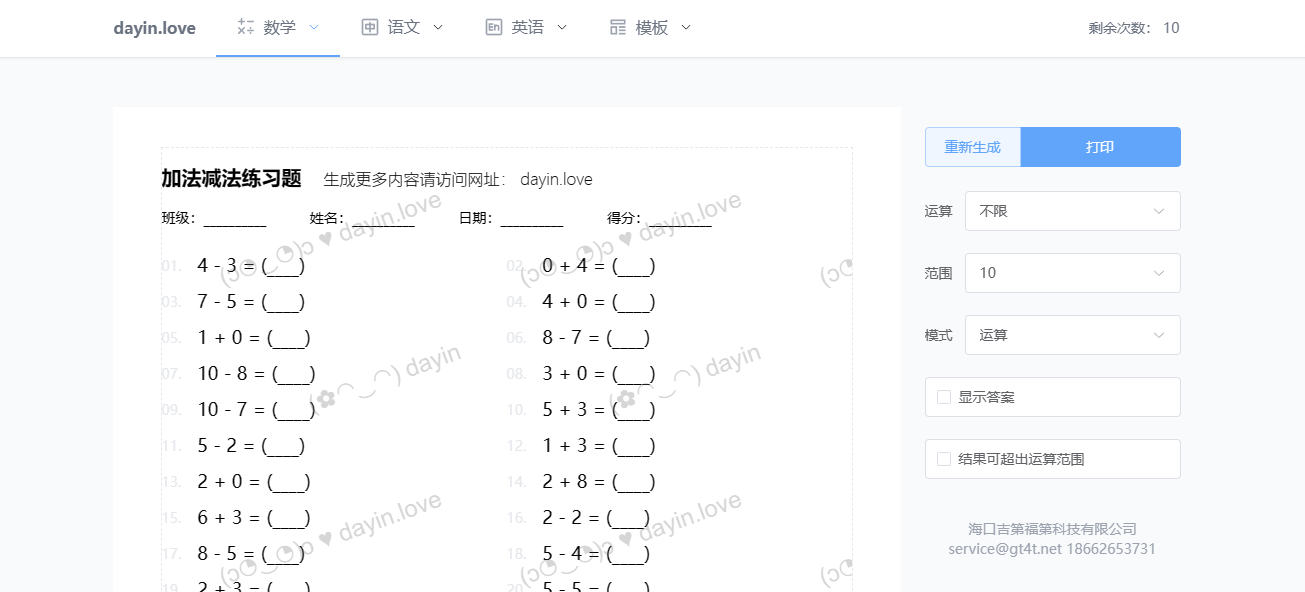 第五步:确认无误后,点击“生成”或类似的按钮,dayin.love会根据您的设置生成相应的算术题或字帖。然后,您可以选择下载生成的文件,通常是以PDF或其他格式提供,方便您打印或保存到本地使用。
