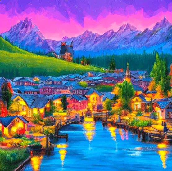 动漫风格的风景画,有山脉、湖泊,也有繁华的小镇子,色彩鲜艳,光影效果明显。