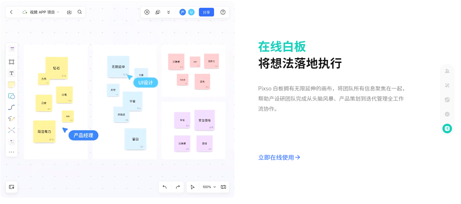 Pixso作为新一代的设计协作工具,通过跨平台的协同、文件实时云同步以及智能设计和协作功能,打通产品、设计到研发的工作链路,全面覆盖产品原型、UI/UX设计、原型交互、设计交付全流程,浏览器即开即用,可大幅提升团队设计协作效率。 目前,Pixso在国内率先实现矢量网格等新型图形算法,渲染性能和稳定性表现出色,对于十万图层的大文件体验流畅,且兼容Figma 、 Sketch 、 XD 、 Axure 等主流UI/UX设计工具,支持多格式文件导入。