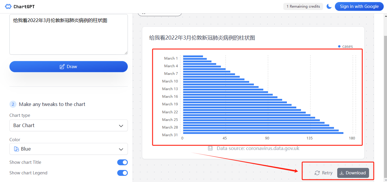 第四步:点击“生成图表”按钮,等待AI生成图表。在下方的区域中查看生成的图表,可以点击“编辑图表”按钮进行在线修改,也可以点击“下载图表”按钮保存到本地。
