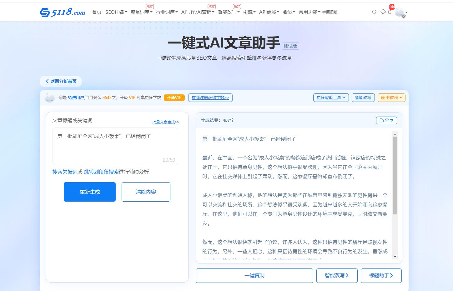AI写作工具哪个好?5118AI写作工具利用大数据算法进行文章在线生成,对搜索引擎算法进行优化,使生成的文章满足搜索引擎排名要求,提高网站收录并获得关键词排名,无论是产品描述、网站文章还是文本营销,AI写作都能为你提供好的创意及内容,为您节省时间和精力,立即免费试用,开启AI智能营销时代!