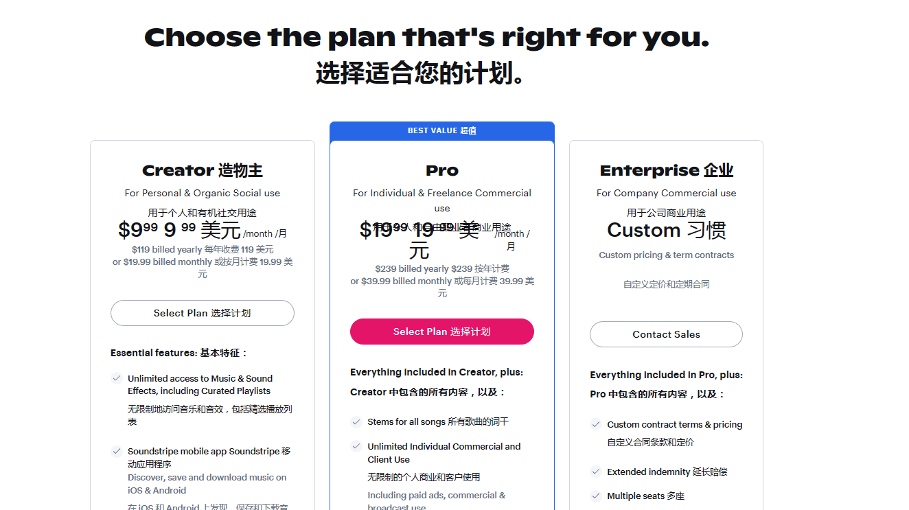 Pro:适用于个人和自由职业者的商业使用,每月19.99美元,每年239美元,或者每月39.99美元。包括Creator计划的所有功能,以及使用歌曲的各个部分,无限制地进行个人商业和客户使用,包括付费广告,商业和广播使用,清除和变现多达五个YouTube频道的功能,以及后期制作的功能和工具,如项目,Premiere Pro,和Frame.io。