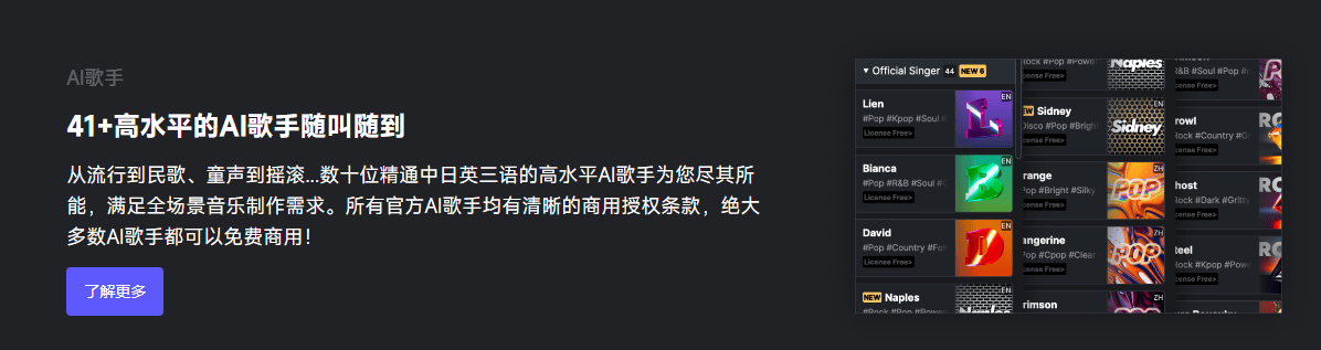 ACE Studio 的官方AI歌手均有清晰的商用授权条款,绝大多数AI歌手都可以免费商用。
