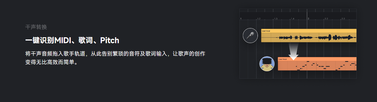 2、干声转换:一键识别MIDI、歌词和音高,将干声转换为MIDI剪辑,让您摆脱输入歌词和音符的不便,轻松进行歌声制作。